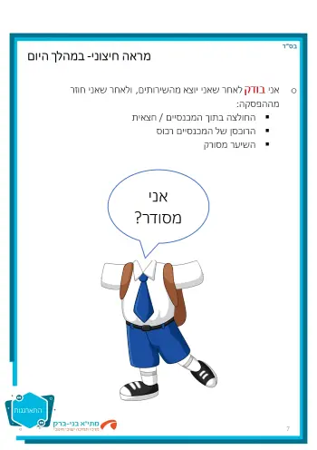 הכרטיס שלפניכם מהווה מחוון לבקרה עצמית לפני היציאה מהבית בבוקר. המטרה היא שהתלמיד יוכל לתת לעצמו משוב על ההתארגנות שלו בבוקר, על פי אמות מידה מקובלות במסגרת בה הוא לומד. המטרה היא להביאו למצב בו יעשה זאת בסופו של דבר באופן אוטומטי. מובן, כי בקרה עצמית כזו יכולה לשרת אותו גם בהמשך דרכו, לאחר סיום הלימודים, לדוגמה: ביציאה למקום עבודה, ביציאה לאירועים חברתיים, וכיו"ב. מומלץ לקבוע מראה גדולה לצד כרטיס הניווט, בחדרו של התלמיד (או במקום אחר בבית), על מנת לאפשר לו להתבונן ולוודא שהופעתו אכן נקייה ומסודרת, בהתאם לטקסט בכרטיס הניווט.