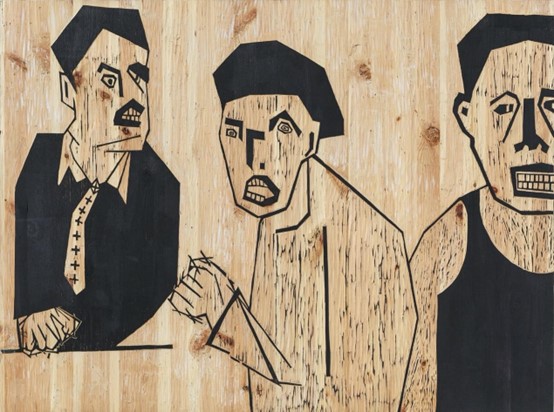 בכל יצירה דמות אחת, רוב הדמויות הן גבריות ותוקפניות. בנוסף לפסלים הללו, על הקירות תלויה סדרת יצירות המציגות אינטראקציה בין גברים, שעשויות בטכניקה של שמן על עץ. למשל, ״הבר״ – יצירה שבה נראות שלוש דמויות עם שיניים חשופות: שתיים מהן פונות זו אל זו בהבעת פנים מאיימת, ונדמה שכל אחת מהן מתכוננת להניף את אגרופה; הדמות השלישית הניצבת לצידם מביטה במתרחש ונראית מאוימת. סיון כותב על כך ביומן העבודה: