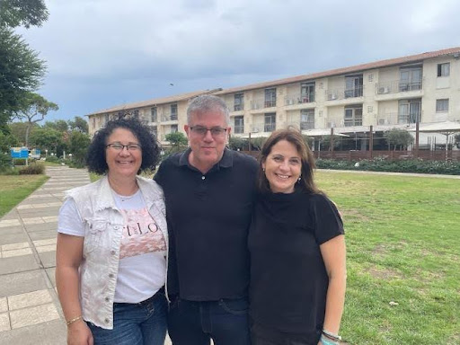 באותו יום שלישי ה10.10 המקום היה נראה כשדה קרב או תאג"ד עורפי, חיילים, מחסומים, מתנדבים, מפונים, אפודים זוהרים אפודים קרמים, ארגזים, רשימות חיבוקים ודמעות. ד"ר טל קרן הייתה טרוטת עיניים בתנועה מתמדת ומנסה לשדר רוגע סביבה, עם אפוד זוהר עליה מנסה ביחד עם הצוות הקטן והמגויס של שפ״ח חוף השרון לתת ככל יכולתה למענה כמעט בלתי אפשרי. היום פגשתי אישה אחרת, שאני לא בטוח הייתי מזהה לולא פנתה אלי. ניכר כי הצליחה לחזור לחיים שפויים יותר. היא גם לא הייתה לבדה, היו איתה קולגות, שותפים למעשה ולחיים. שלושתם חברים עוד מימי התואר השני באוניברסיטת בן גוריון שם למדו יחד פסיכולוגיה חינוכית. מאז כל אחד המשיך לדרכו: קרן המשיכה לדוקטורט, עבדה בשפ״ח כפר סבא ומשם עברה לניהול שפ"ח חוף השרון, חיים המשיך כמומחה בתחום החירום , מנהל את שפ"ח שער הנגב ומכהן כרכז חירום ארצי של שפ״י, ולבנת התמחתה בטיפול זוגי ומשפחתי וטיפול בטראומה. כעת הם חברו שוב בכדי לנסות ולהשיג פתרון טיפולי חינוכי שיקומי והתפתחותי עבור המפונים תחת חסותם. (בתמונה- ד"ר קרן טל, חיים פליישמן ולבנת איטלי. צילום : אלי חוה)